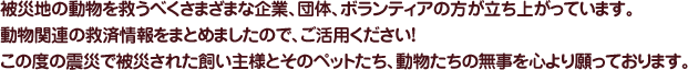 現在行政及び動物救済団体関連に被災動物救護についてのお問合せが多く寄せられています。